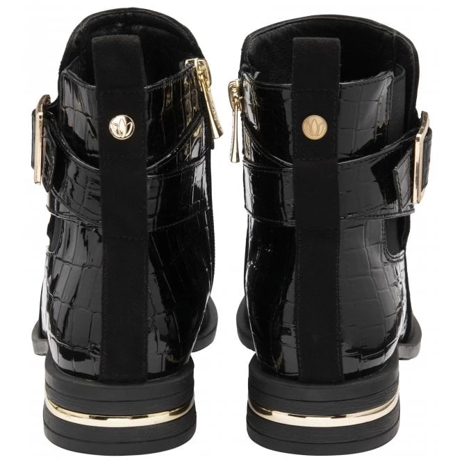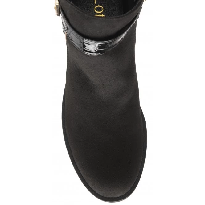 Ladies meet your new wardrobe go-to, introducing the Lotus Laurel boot! Sitting just above the ankle, this women’s black faux suede boot takes design elements from a Chelsea boot but with subtle upgrades. Overlapping an elasticated side panel is an interlinking wraparound buckle feature that is enhanced with a mock-croc print. This distinctive print has also been applied to the glossy heel counter, plus a metal trim insert has been incorporated into the 3cm heel. Easy to wear and even easier to style, this ladies’ ankle boot will quickly become an all-time favourite.