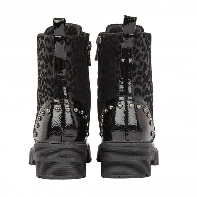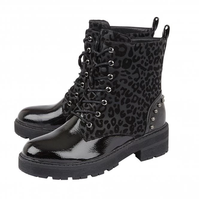 Attain style kudos when you step out in a pair of Lotus Elena ankle boots. Stud embellishments, animal printed side panels and a glossy patent toe and heel counter all accentuate this black lace-up ankle boot that is set on a chunky cleated sole unit.