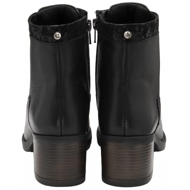 Perfect for transitional dressing and beyond is the Lotus Boston ankle boot. Giving this women’s black boot a significant point of difference is a feminine floral print that has been applied to the top collar and the front panel. Decorative strap detailing also accentuates the aesthetic of this women’s ankle boot. Nestled on a wearable 5.5cm wooden stack effect heel, this Lotus black boot is a true wardrobe staple!