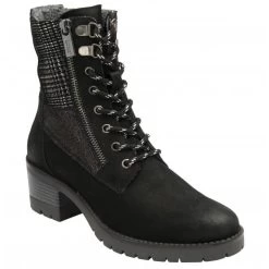 Highly functional and exceptionally easy to style is the Lotus Oklahoma ankle boot! This women’s black leather lace-up boot is an evolution of the ever-popular walking boot, as it encompasses distinguished features including eyelet and D-ring lacing, plus a heavy cleated sole and a 6cm block heel. Giving this Lotus women’s black boot a distinctive finish is the plaid print that is applied to the side panel, alongside an exposed zip. The faux shearling lining provides additional comfort and warmth.