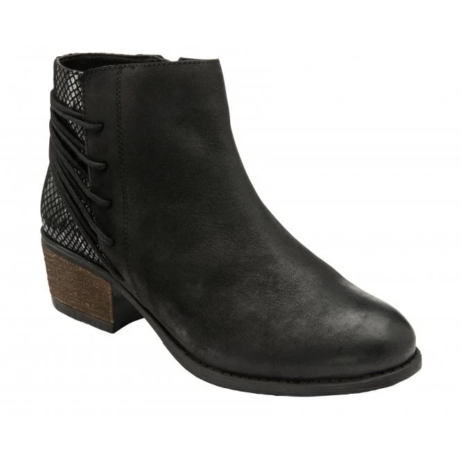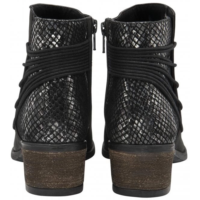 The combination of a striking reptile print with elasticated lace overlays at the back of the Lotus Etta ankle boot adds a distinctive finish and will add flair to any casual look. Crafted from premium leather, resting on a 4.5cm block heel and featuring an inside zip, this women’s black boot with a soft almond pointed toe is exceptionally wearable and highly versatile.