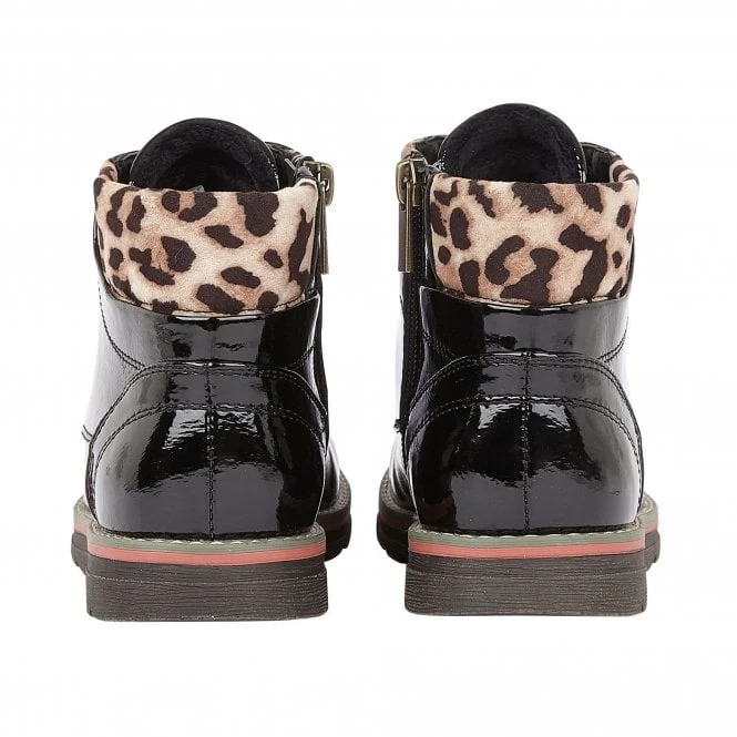 Two of this season’s key trends have been amalgamated on the Lotus Naomi ankle boot; hiking boot styling and leopard print detailing on the ankle collar are evident on this almost flat Lotus boot. The glossy patent upper on this women’s lace-up black ankle boot is also met with gold metal eyelets and a serrated sole unit to give it a modern day vibe.