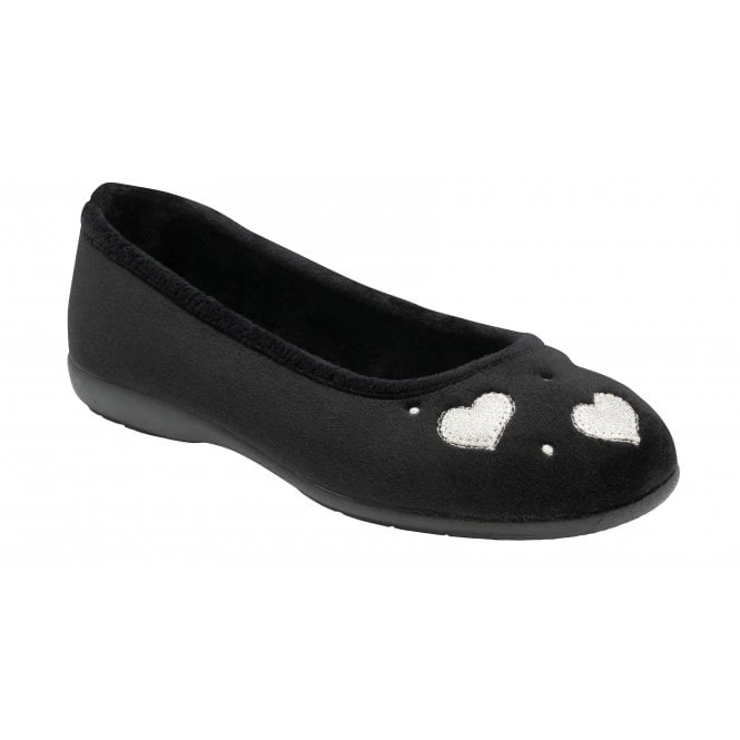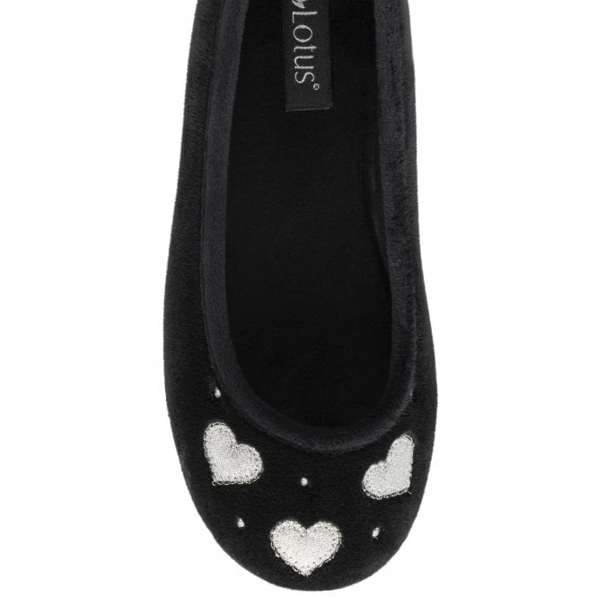 Giving the black ballerina slipper Lois a delightful finishing touch are cute glitter love hearts and metallic embroidered spots. Crafted with a soft touch textile upper and lining, plus a rubber outsole for enhanced durability, this Lotus women’s full shoe slipper is as practical as it is stylish.