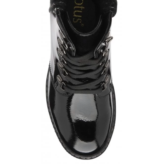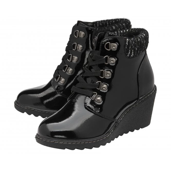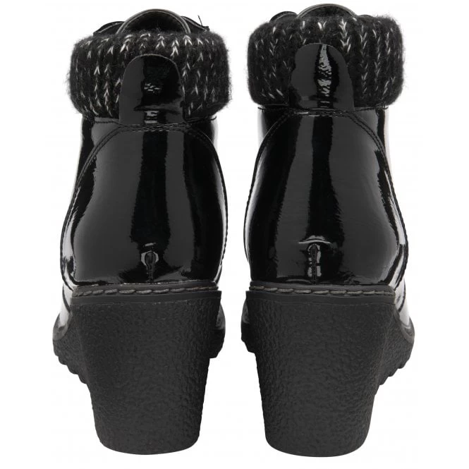 Taking styling cues from the hiker boot trend is the Lotus Philomena lace-up ankle boot. This women’s black patent boot encapsulates D-ring lacing, a knitted ankle collar and a trend relevant 7cm wedge heel. Philomena really is the perfect pairing to off-duty looks.
