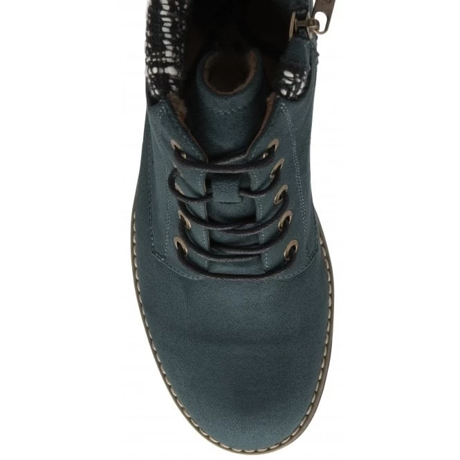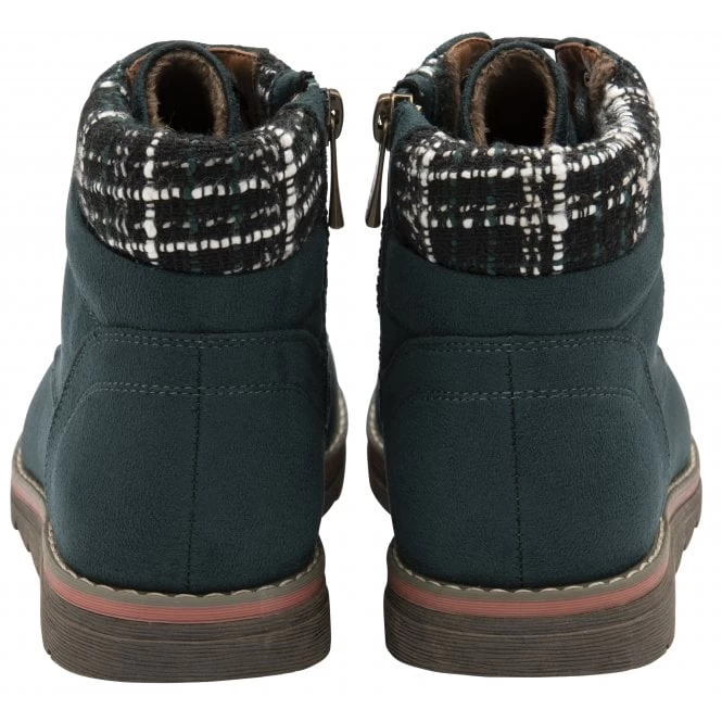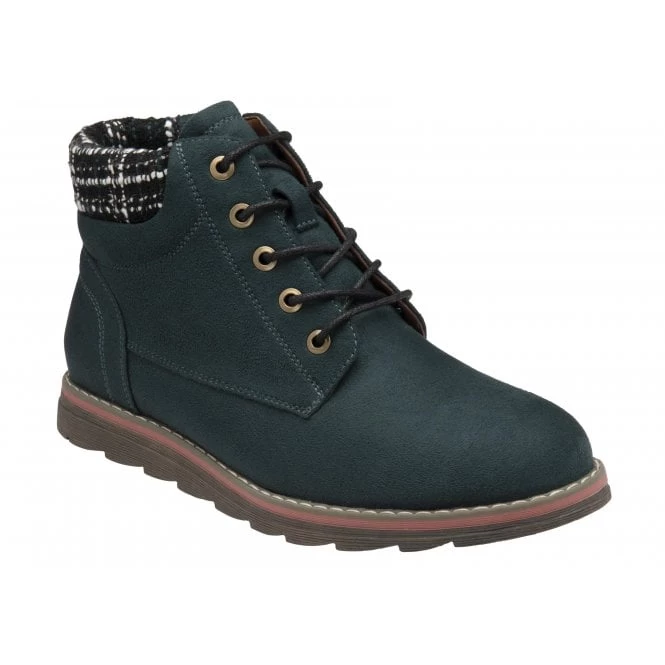 For a thoroughly modern-day aesthetic, add the almost flat Lotus Cedar lace-up ankle boot to casual looks. Influenced by the ever-popular hiker look, this Lotus women’s lace-up green boot boasts an imi-suede upper, a multicoloured knitted ankle collar, metal eyelets and a serrated sole unit.