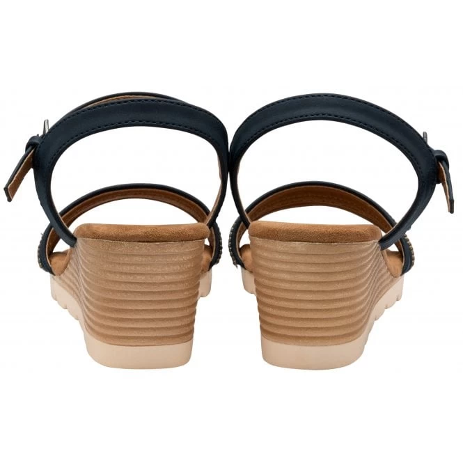 The Lotus Nantes sandal is perfect for summer occasions or for adding a glam twist to favourite denim pieces. This women’s open toe navy sandal is enhanced by a band of sparkling diamantes on the upper, a wearable 6.5cm wooden stack effect wedge heel and a slender ankle strap fastening. This women’s Lotus wedge sandal is totally irresistible and ideal for teaming with an abundance of ensembles.