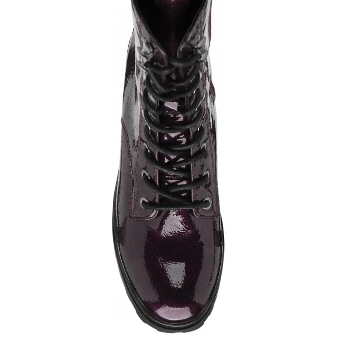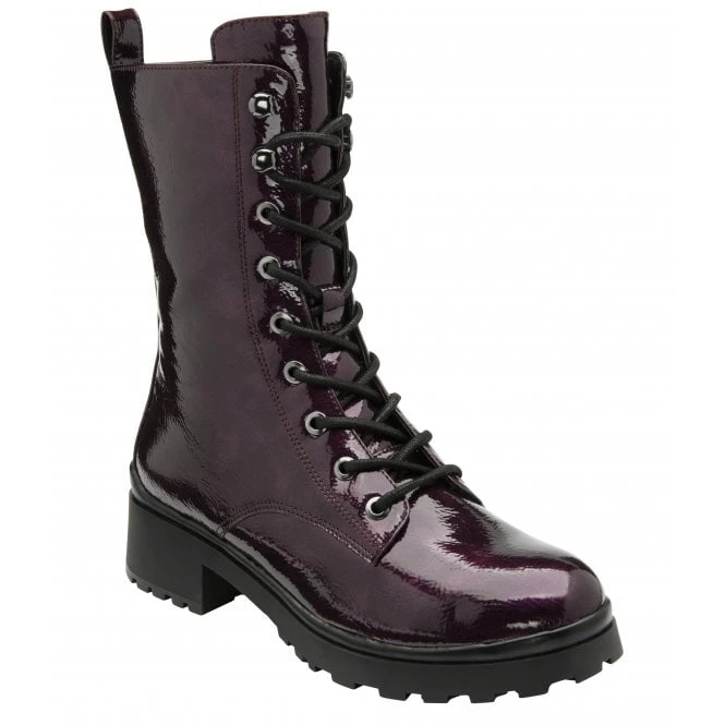 The Delaney boot is Lotus’s answer to the utilitarian trend. Minimalistic in its design, this Lotus mid-calf boot is constructed with a glossy patent upper, a heavy cleated sole and a 3cm block heel. In addition, this purple patent women’s boot is finished with an inside zip so the laces need not be adjusted to get this striking style on/off. The Lotus Delaney boot will certainly add an edgy finish to off-duty looks.
