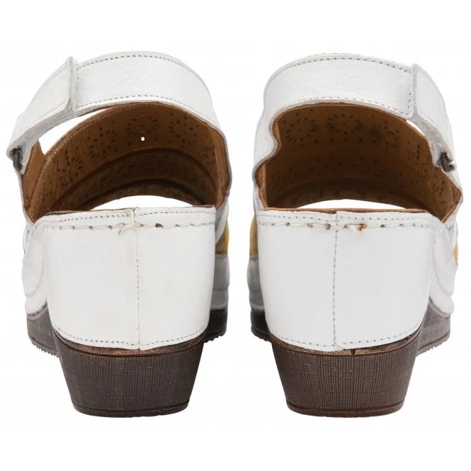A trio of colours teamed with decorative punchwork can be found on the leather upper of the Lotus Neylan sandal. This women’s open toe white, yellow and grey sandal also encapsulates an on-trend 7cm wedge heel and comfort attributes including a leather lining, a cushioned in-sock and an adjustable rip-tape slingback for a custom fit.